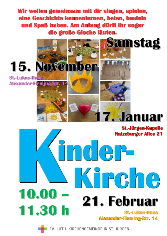 Wir wollen gemeinsam mit dir singen, spielen, eine Geschichte kennenlernen, beten, basteln und in der St.-Jürgen-Kapelle (Ratzeburger Allee 21) Spaß haben.